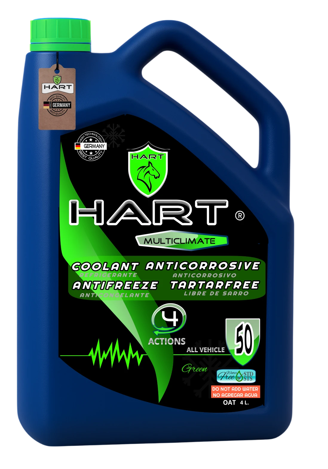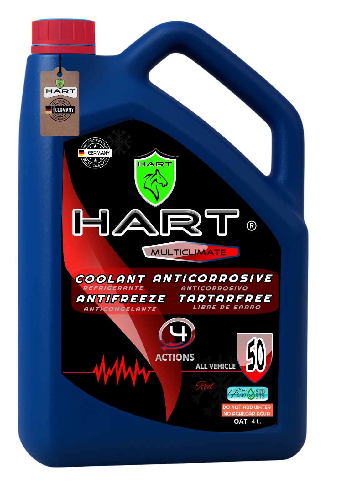 Descubre el HART® MULTICLIMATE 50, un refrigerante multimarca de alta calidad diseñado para satisfacer las necesidades de todo tipo de vehículos. Este producto ofrece 4 acciones en 1: Refrigerante, Anticongelante, Antioxidante y Antisarro. Compatible con motores de cualquier tipo de material, incluyendo acero, hierro fundido, aluminio y más, garantizando un rendimiento óptimo y protección duradera.